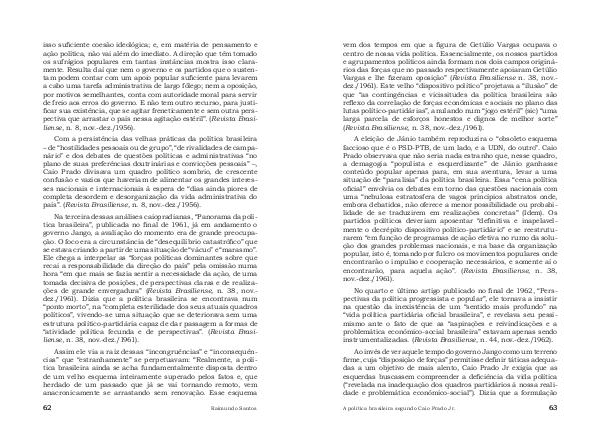 vem dos tempos em que a figura de Getúlio Vargas ocupava o centro de nossa vida política. Essencialmente, os nossos partidos e agrupamentos políticos ainda formam nos dois campos originários das forças que no passado respectivamente apoiaram Getúlio Vargas e lhe fizeram oposição”( Revista Brasiliense n. 38, nov.- dez./ 1961). Este velho“ dispositivo político” projetava a“ ilusão” de que“ as contingências e vicissitudes da política brasileira são reflexo da correlação de forças econômicas e sociais no plano das lutas político-partidárias”, anulando num“ jogo estéril”( sic)“ uma larga parcela de esforços honestos e dignos de melhor sorte”( Revista Brasiliense, n. 38, nov.-dez./ 1961).