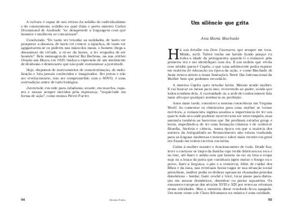 Há um detalhe em Dom Casmurro, que sempre me toca. Miúdo, sutil. Talvez tenha me batido fundo porque eu tinha a idade da protagonista quando li o romance pela primeira vez e me identifiquei com ela. É um indício que revela com nitidez quem é Capitu, o que uma adolescente podia esperar em matéria de educação na época da ação, e como Machado de Assis estava atento a essas limitações. Neste Dia Internacional da Mulher bem que podemos recordá-lo.