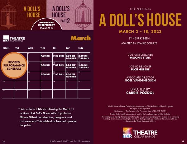 A Doll ' s House at Theatre Cedar Rapids is sponsored by OPN Architects and Ryan Companies and is part of the Linge Series .