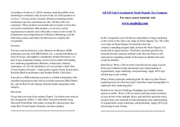 According to Lamb et al.( 2014), business marketing differs from marketing to consumers only in terms of the use of the products or services ─ leaving out the consumer. Business marketing entails marketing to persons and businesses who will then offer it to consumers. These products can include parts of goods or those that are used to manufacture other products, or services used by organizations to operate more efficiently or that are later resold. To demonstrate your comprehension of Business Marketing, read the following scenario and follow the directions to complete this Assignment.