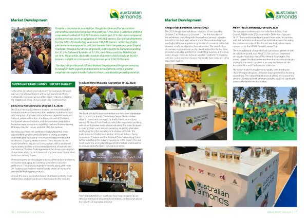 The 2023 Anuga trade exhibition took place from Saturday , October 7 , to Wednesday , October 11 . The first two days of the exhibition , coinciding with the weekend , proved to be the busiest for the Australian almond stand . The overhead signage was highly effective in promoting the stand ’ s presence in the hall , drawing significant attention from attendees . The introduction of a private meeting room on the stand , utilised for the first time , provided a valuable addition for conducting business at this busy event . Anuga continues to be an excellent platform for meeting with key customers from Europe , the Middle East , India , and other important markets .