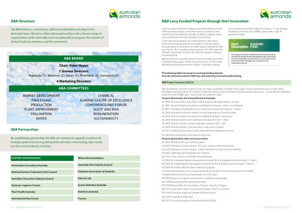 Projects delivered by the Almond Board of Australia AL19000 Almond Centre of Excellence experimental and demonstration orchard AL19001 Almond Industry Innovation and Adoption Program – phase 1 ( completed ) AL20001 Evaluation of potential prunus rootstocks for almond production - stage 3 AL22000 Evaluating self-fertile varieties in block plantings for almond growers AL22001 Almond industry innovation and adoption program - phase two AL22004 Almond market access and trade development 2023 – 2026 AL22007 Almond industry statistics and data collection 2023 - 2025 AL22008 Almond industry communications and events program AL23001 Enabling the pathway to best sustainable management practices