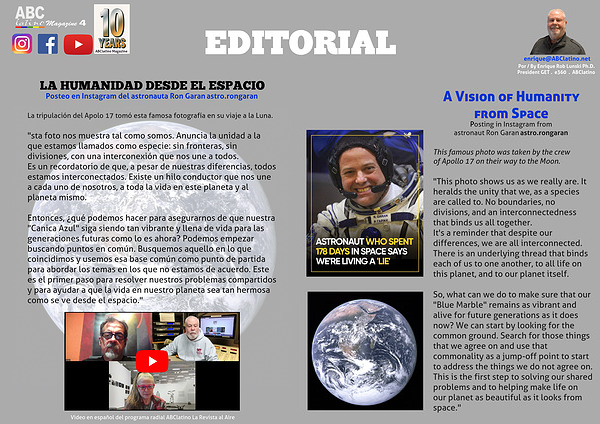 Entonces, ¿qué podemos hacer para asegurarnos de que nuestra "Canica Azul" siga siendo tan vibrante y llena de vida para las generaciones futuras como lo es ahora? Podemos empezar buscando puntos en común. Busquemos aquello en lo que coincidimos y usemos esa base común como punto de partida para abordar los temas en los que no estamos de acuerdo. Este es el primer paso para resolver nuestros problemas compartidos y para ayudar a que la vida en nuestro planeta sea tan hermosa como se ve desde el espacio."