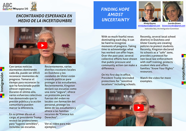 En su primer día en el cargo, el presidente Trump revocó las protecciones para "lugares sensibles", incluidas las escuelas. Recientemente, varios distritos escolares locales en Dutchess y los condados de Ulster están creando políticas para proteger a los estudiantes. Recientemente, Kingston declaró sus escuelas como una zona "segura", ofrece un protocolo para las fuerzas del orden no locales con formación del personal, protege los datos de los estudiantes y ofrece a las familias recursos de "Conoce tus Derechos".