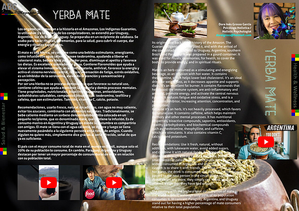 El mate es una hierva, se consume como una bebida estimulante, energizante, como infusión con agua caliente, posee teobromina, ayudando a liberar el colesterol malo, bebida ideal para perder peso, disminuye el apetito y favorece las dietas. Es excelente quemador de grasa. Contiene Flavonoides que ayuda a elevar el sistema inmunitario, es antiinflamatorio, antiviral, favorece la energía y activa el sistema nervioso central, reduce la sensación de fatiga, estrés oxidativo, es un inhibidor de la serotonina, elevando la atención y concentración y percepción.