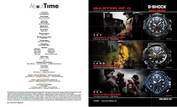 4 | AboutTime Magazine in this magazine. Your misuse of the Trademarks displayed on this Web Site, or any other content in this magazine, except as provided herein, is strictly prohibited.” AboutTime Magazine is published quarterly both in print and digitally by Isochron Media LLC, 25 Gay Bower Rd. Monroe, CT, 06468. One year( four issues) subscription $ 25.00. Copyright 2016, all rights reserved. Editorial inquiries should be sent to Isochron Media address. All views and opinions expressed within are those of the writers and do not necessarily reflect those of AboutTime Magazine or Isochron Media, LLC. ISSN 2169-5814