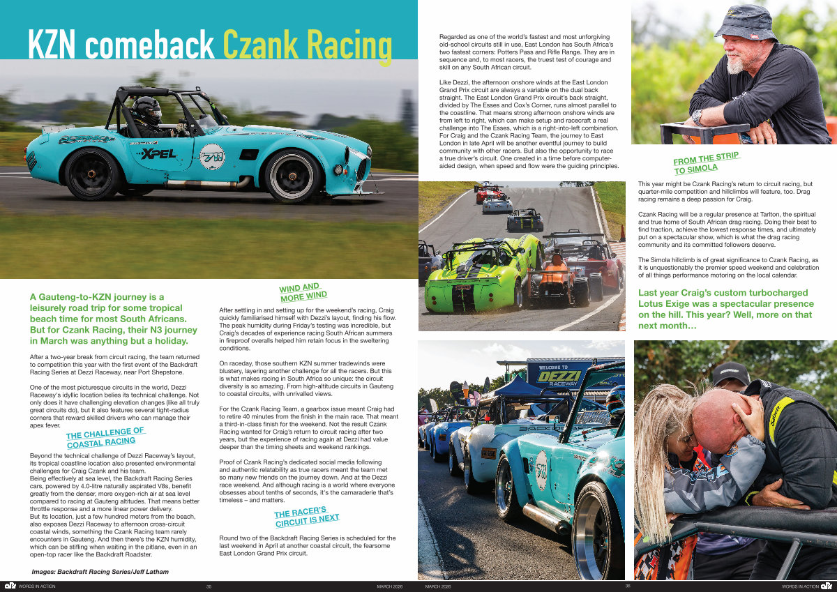 Like Dezzi, the afternoon onshore winds at the East London Grand Prix circuit are always a variable on the dual back straight. The East London Grand Prix circuit’ s back straight, divided by The Esses and Cox’ s Corner, runs almost parallel to the coastline. That means strong afternoon onshore winds are from left to right, which can make setup and racecraft a real challenge into The Esses, which is a right-into-left combination. For Craig and the Czank Racing Team, the journey to East London in late April will be another eventful journey to build community with other racers. But also the opportunity to race a true driver’ s circuit. One created in a time before computeraided design, when speed and flow were the guiding principles.