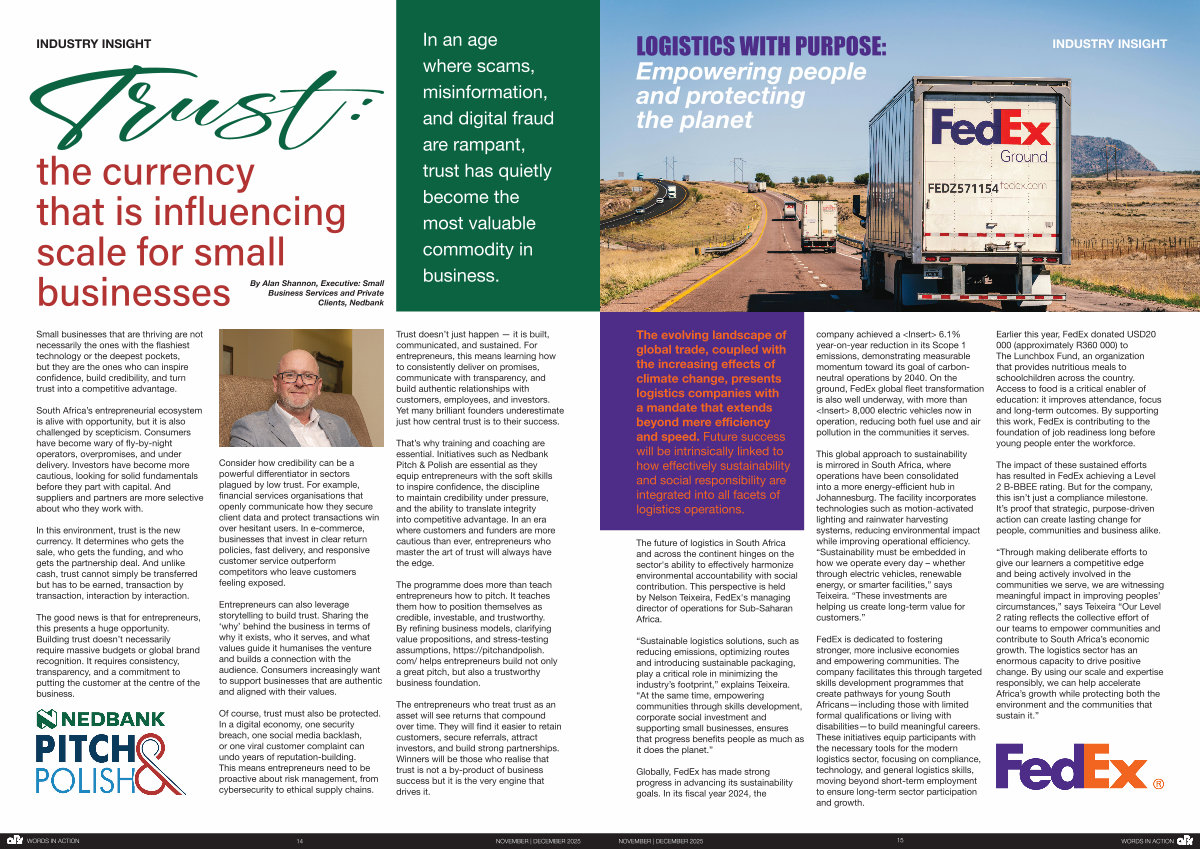 “ Sustainable logistics solutions, such as reducing emissions, optimizing routes and introducing sustainable packaging, play a critical role in minimizing the industry’ s footprint,” explains Teixeira.“ At the same time, empowering communities through skills development, corporate social investment and supporting small businesses, ensures that progress benefits people as much as it does the planet.”