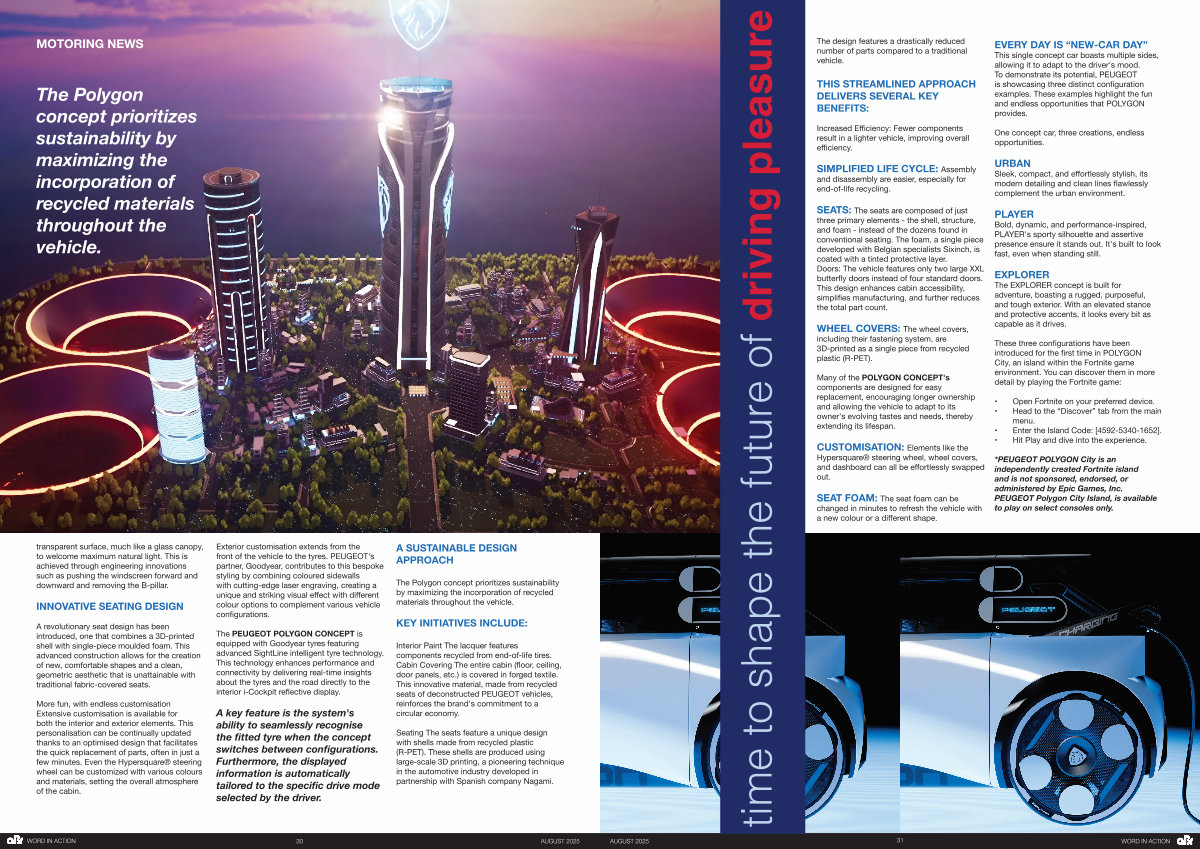 The PEUGEOT POLYGON CONCEPT is equipped with Goodyear tyres featuring advanced SightLine intelligent tyre technology. This technology enhances performance and connectivity by delivering real-time insights about the tyres and the road directly to the interior i-Cockpit reflective display.
