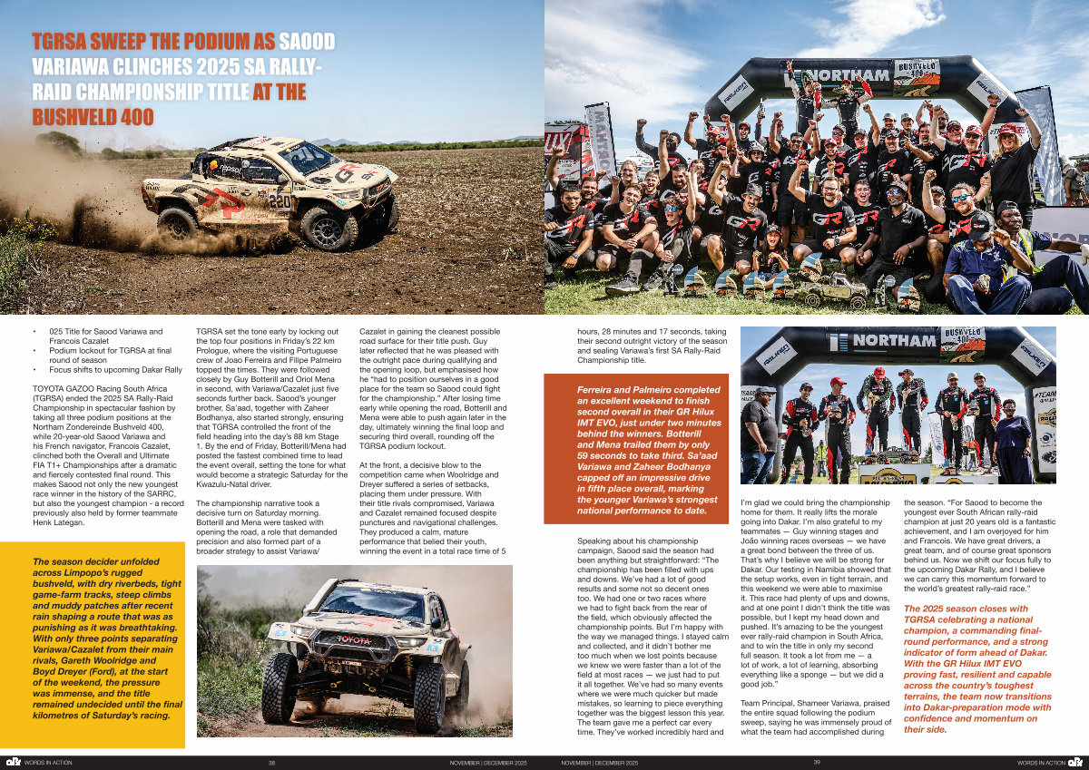 the season.“ For Saood to become the youngest ever South African rally-raid champion at just 20 years old is a fantastic achievement, and I am overjoyed for him and Francois. We have great drivers, a great team, and of course great sponsors behind us. Now we shift our focus fully to the upcoming Dakar Rally, and I believe we can carry this momentum forward to the world’ s greatest rally-raid race.”