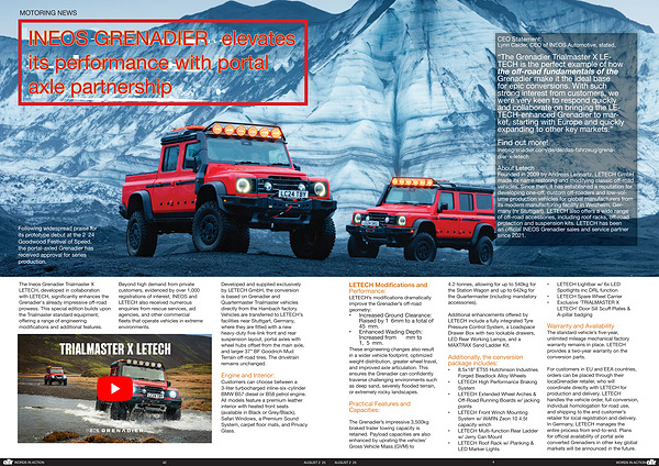 “ The Grenadier Trialmaster X LE- TECH is the perfect example of how the off-road fundamentals of the Grenadier make it the ideal base for epic conversions. With such strong interest from customers, we were very keen to respond quickly and collaborate on bringing the LE- TECH-enhanced Grenadier to market, starting with Europe and quickly expanding to other key markets.”