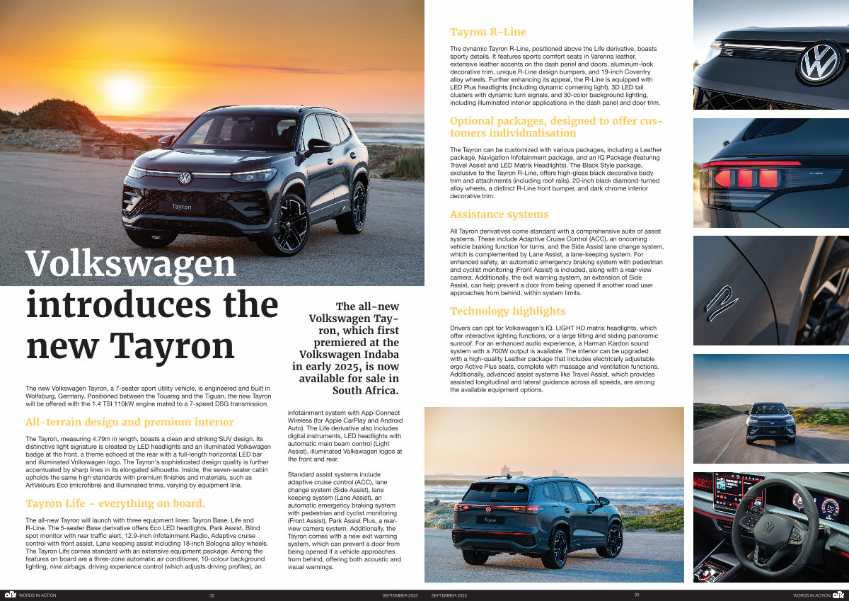 All Tayron derivatives come standard with a comprehensive suite of assist systems. These include Adaptive Cruise Control( ACC), an oncoming vehicle braking function for turns, and the Side Assist lane change system, which is complemented by Lane Assist, a lane-keeping system. For enhanced safety, an automatic emergency braking system with pedestrian and cyclist monitoring( Front Assist) is included, along with a rear-view camera. Additionally, the exit warning system, an extension of Side Assist, can help prevent a door from being opened if another road user approaches from behind, within system limits.