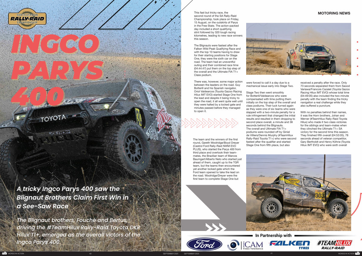 The team and the winners of the first round, Gareth Woolridge / Boyd Dreyer( Castrol Ford Rally-Raid NWM EVO PLUS), who started the Parys 400 from third place and overtook their teammates, the Brazilian team of Marcos Baumgart / Alberto Neto who started just ahead of them, caught up to the TGR team, but the teams then encountered yet another locked gate which the Ford team opened to take the lead on the road. Woolridge / Dreyer were the first team to complete Stage One but were forced to call it a day due to a mechanical issue early into Stage Two.