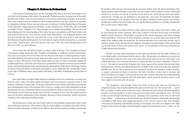Like John Luther , Zwingli ' s father desired an education for his son , and the boy was early sent from his native valley . His mind rapidly developed , and it soon became a question where to find teachers competent to instruct him . At the age of thirteen he went to Bern , which then possessed the most distinguished school in Switzerland . Here , however , a danger arose which threatened to blight the promise of his life . Determined efforts were put forth by the friars to allure him into a monastery . The Dominican and Franciscan monks were in rivalry for popular favour . This they endeavoured to secure by the showy adornments of their churches , the pomp of their ceremonials , and the attractions of famous relics and miracle-working images .