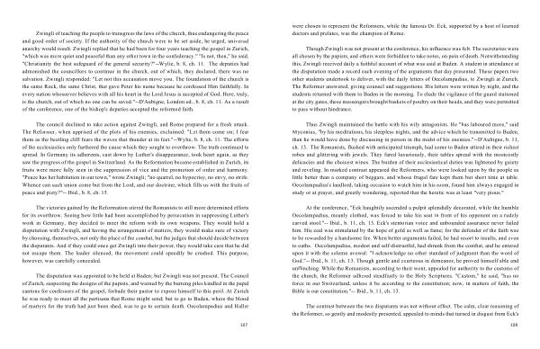 Zwingli of teaching the people to transgress the laws of the church , thus endangering the peace and good order of society . If the authority of the church were to be set aside , he urged , universal anarchy would result . Zwingli replied that he had been for four years teaching the gospel in Zurich , " which was more quiet and peaceful than any other town in the confederacy ." " Is not , then ," he said , " Christianity the best safeguard of the general security ?" --Wylie , b . 8 , ch . 11 . The deputies had admonished the councillors to continue in the church , out of which , they declared , there was no salvation . Zwingli responded : " Let not this accusation move you . The foundation of the church is the same Rock , the same Christ , that gave Peter his name because he confessed Him faithfully . In every nation whosoever believes with all his heart in the Lord Jesus is accepted of God . Here , truly , is the church , out of which no one can be saved ." --D ' Aubigne , London ed ., b . 8 , ch . 11 . As a result of the conference , one of the bishop ' s deputies accepted the reformed faith .