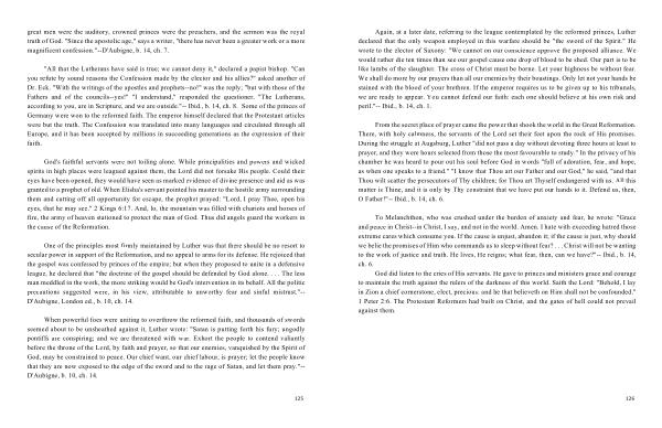 " All that the Lutherans have said is true ; we cannot deny it ," declared a papist bishop . " Can you refute by sound reasons the Confession made by the elector and his allies ?" asked another of Dr . Eck . " With the writings of the apostles and prophets--no !" was the reply ; " but with those of the Fathers and of the councils--yes !" " I understand ," responded the questioner . " The Lutherans , according to you , are in Scripture , and we are outside ." -- Ibid ., b . 14 , ch . 8 . Some of the princes of Germany were won to the reformed faith . The emperor himself declared that the Protestant articles were but the truth . The Confession was translated into many languages and circulated through all Europe , and it has been accepted by millions in succeeding generations as the expression of their faith .