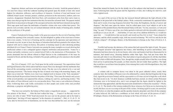 " The host was carried by the bishop of Paris under a magnificent canopy , . . . supported by four princes of the blood . . . . After the host walked the king . . . . Francis I on that day wore no crown , nor robe of state ." With " head uncovered , his eyes cast on the ground , and in his hand a lighted taper ," the king of France appeared " in the character of a penitent ." -- Ibid ., b . 13 , ch . 21 . At every altar he bowed down in humiliation , nor for the vices that defiled his soul , nor the innocent