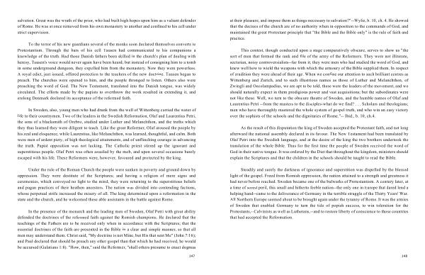 This contest , though conducted upon a stage comparatively obscure , serves to show us " the sort of men that formed the rank and file of the army of the Reformers . They were not illiterate , sectarian , noisy controversialists--far from it ; they were men who had studied the word of God , and knew well how to wield the weapons with which the armoury of the Bible supplied them . In respect of erudition they were ahead of their age . When we confine our attention to such brilliant centres as Wittenberg and Zurich , and to such illustrious names as those of Luther and Melanchthon , of Zwingli and Oecolampadius , we are apt to be told , these were the leaders of the movement , and we should naturally expect in them prodigious power and vast acquisitions ; but the subordinates were not like these . Well , we turn to the obscure theatre of Sweden , and the humble names of Olaf and Laurentius Petri --from the masters to the disciples-what do we find ? . . . Scholars and theologians ; men who have thoroughly mastered the whole system of gospel truth , and who win an easy victory over the sophists of the schools and the dignitaries of Rome ." -- Ibid ., b . 10 , ch . 4 .