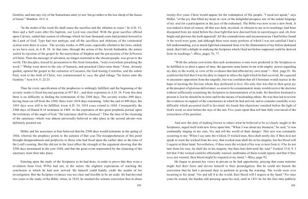 twenty-five years Christ would appear for the redemption of His people . " I need not speak ," says Miller , " of the joy that filled my heart in view of the delightful prospect , nor of the ardent longings of my soul for a participation in the joys of the redeemed . The Bible was now to me a new book . It was indeed a feast of reason ; all that was dark , mystical , or obscure to me in its teachings , had been dissipated from my mind before the clear light that now dawned from its sacred pages ; and , oh , how bright and glorious the truth appeared ! All the contradictions and inconsistencies I had before found in the word were gone ; and although there were many portions of which I was not satisfied I had a full understanding , yet so much light had emanated from it to the illumination of my before darkened mind , that I felt a delight in studying the Scripture which I had not before supposed could be derived from its teachings ." --Bliss , pages 76 , 77 .