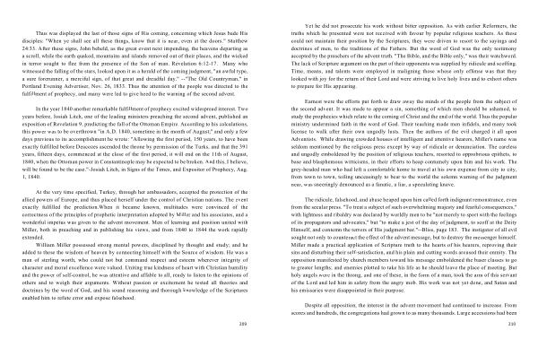 In the year 1840 another remarkable fulfillment of prophecy excited widespread interest . Two years before , Josiah Litch , one of the leading ministers preaching the second advent , published an exposition of Revelation 9 , predicting the fall of the Ottoman Empire . According to his calculations , this power was to be overthrown " in A . D . 1840 , sometime in the month of August ;" and only a few days previous to its accomplishment he wrote : " Allowing the first period , 150 years , to have been exactly fulfilled before Deacozes ascended the throne by permission of the Turks , and that the 391 years , fifteen days , commenced at the close of the first period , it will end on the 11th of August , 1840 , when the Ottoman power in Constantinople may be expected to be broken . And this , I believe , will be found to be the case ." -Josiah Litch , in Signs of the Times , and Expositor of Prophecy , Aug . 1 , 1840 .