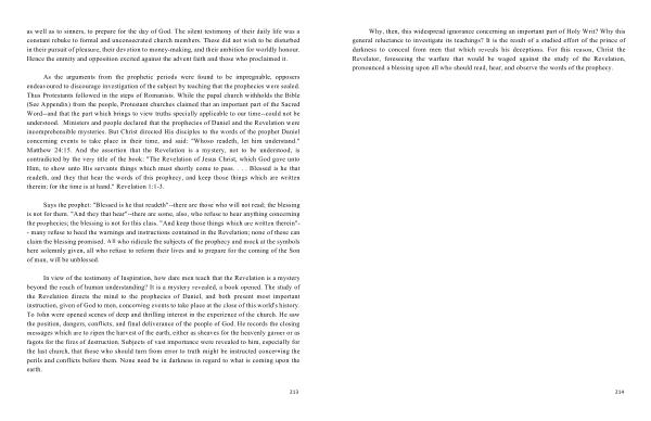 As the arguments from the prophetic periods were found to be impregnable , opposers endeavoured to discourage investigation of the subject by teaching that the prophecies were sealed . Thus Protestants followed in the steps of Romanists . While the papal church withholds the Bible ( See Appendix ) from the people , Protestant churches claimed that an important part of the Sacred Word--and that the part which brings to view truths specially applicable to our time--could not be understood . Ministers and people declared that the prophecies of Daniel and the Revelation were incomprehensible mysteries . But Christ directed His disciples to the words of the prophet Daniel concerning events to take place in their time , and said : " Whoso readeth , let him understand ." Matthew 24:15 . And the assertion that the Revelation is a mystery , not to be understood , is contradicted by the very title of the book : " The Revelation of Jesus Christ , which God gave unto Him , to show unto His servants things which must shortly come to pass . . . . Blessed is he that readeth , and they that hear the words of this prophecy , and keep those things which are written therein : for the time is at hand ." Revelation 1:1-3 .