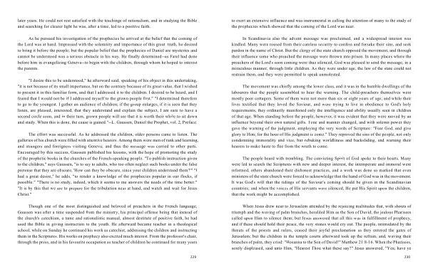 The effort was successful . As he addressed the children , older persons came to listen . The galleries of his church were filled with attentive hearers . Among them were men of rank and learning , and strangers and foreigners visiting Geneva ; and thus the message was carried to other parts . Encouraged by this success , Gaussen published his lessons , with the hope of promoting the study of the prophetic books in the churches of the French-speaking people . " To publish instruction given to the children ," says Gaussen , " is to say to adults , who too often neglect such books under the false pretense that they are obscure , ' How can they be obscure , since your children understand them ?'" " I had a great desire ," he adds , " to render a knowledge of the prophecies popular in our flocks , if possible ." " There is no study , indeed , which it seems to me answers the needs of the time better ." " It is by this that we are to prepare for the tribulation near at hand , and watch and wait for Jesus Christ ."