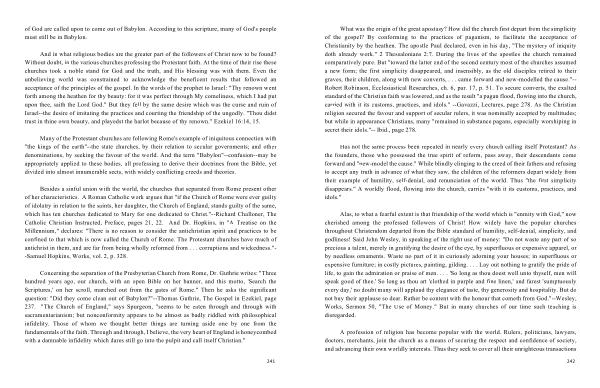 What was the origin of the great apostasy ? How did the church first depart from the simplicity of the gospel ? By conforming to the practices of paganism , to facilitate the acceptance of Christianity by the heathen . The apostle Paul declared , even in his day , " The mystery of iniquity doth already work ." 2 Thessalonians 2:7 . During the lives of the apostles the church remained comparatively pure . But " toward the latter end of the second century most of the churches assumed a new form ; the first simplicity disappeared , and insensibly , as the old disciples retired to their graves , their children , along with new converts , . . . came forward and new-modelled the cause ." -- Robert Robinson , Ecclesiastical Researches , ch . 6 , par . 17 , p . 51 . To secure converts , the exalted standard of the Christian faith was lowered , and as the result " a pagan flood , flowing into the church , carried with it its customs , practices , and idols ." --Gavazzi , Lectures , page 278 . As the Christian religion secured the favour and support of secular rulers , it was nominally accepted by multitudes ; but while in appearance Christians , many " remained in substance pagans , especially worshiping in secret their idols ." -- Ibid ., page 278 .