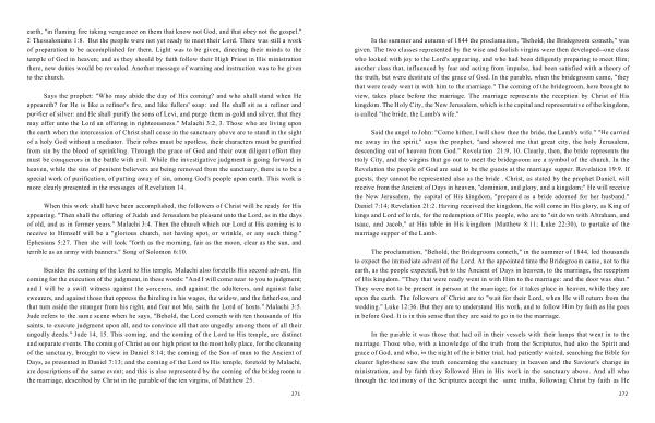 Besides the coming of the Lord to His temple , Malachi also foretells His second advent , His coming for the execution of the judgment , in these words : " And I will come near to you to judgment ; and I will be a swift witness against the sorcerers , and against the adulterers , and against false swearers , and against those that oppress the hireling in his wages , the widow , and the fatherless , and that turn aside the stranger from his right , and fear not Me , saith the Lord of hosts ." Malachi 3:5 . Jude refers to the same scene when he says , " Behold , the Lord cometh with ten thousands of His saints , to execute judgment upon all , and to convince all that are ungodly among them of all their ungodly deeds ." Jude 14 , 15 . This coming , and the coming of the Lord to His temple , are distinct and separate events . The coming of Christ as our high priest to the most holy place , for the cleansing of the sanctuary , brought to view in Daniel 8:14 ; the coming of the Son of man to the Ancient of Days , as presented in Daniel 7:13 ; and the coming of the Lord to His temple , foretold by Malachi , are descriptions of the same event ; and this is also represented by the coming of the bridegroom to the marriage , described by Christ in the parable of the ten virgins , of Matthew 25 .