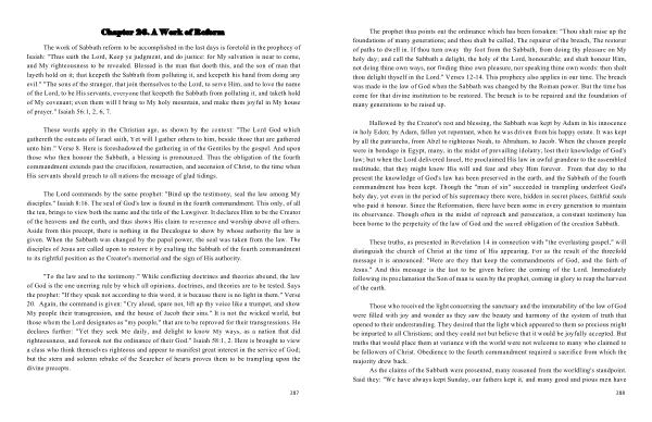 The prophet thus points out the ordinance which has been forsaken : " Thou shalt raise up the foundations of many generations ; and thou shalt be called , The repairer of the breach , The restorer of paths to dwell in . If thou turn away thy foot from the Sabbath , from doing thy pleasure on My holy day ; and call the Sabbath a delight , the holy of the Lord , honourable ; and shalt honour Him , not doing thine own ways , nor finding thine own pleasure , nor speaking thine own words : then shalt thou delight thyself in the Lord ." Verses 12-14 . This prophecy also applies in our time . The breach was made in the law of God when the Sabbath was changed by the Roman power . But the time has come for that divine institution to be restored . The breach is to be repaired and the foundation of many generations to be raised up .