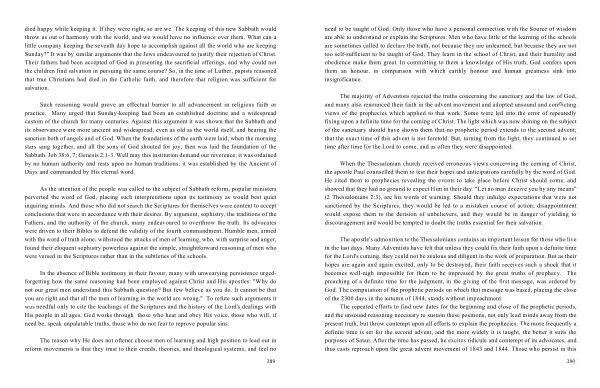 died happy while keeping it . If they were right , so are we . The keeping of this new Sabbath would throw us out of harmony with the world , and we would have no influence over them . What can a little company keeping the seventh day hope to accomplish against all the world who are keeping Sunday ?" It was by similar arguments that the Jews endeavoured to justify their rejection of Christ . Their fathers had been accepted of God in presenting the sacrificial offerings , and why could not the children find salvation in pursuing the same course ? So , in the time of Luther , papists reasoned that true Christians had died in the Catholic faith , and therefore that religion was sufficient for salvation .