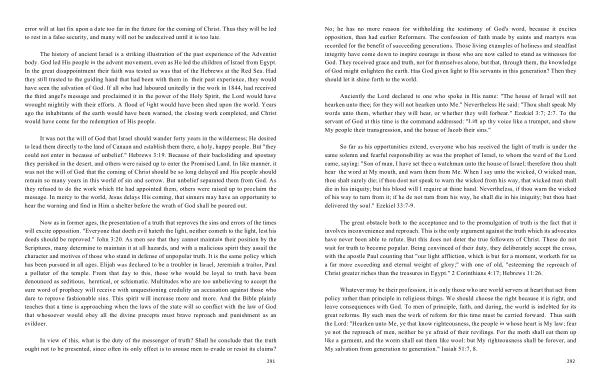 The history of ancient Israel is a striking illustration of the past experience of the Adventist body . God led His people in the advent movement , even as He led the children of Israel from Egypt . In the great disappointment their faith was tested as was that of the Hebrews at the Red Sea . Had they still trusted to the guiding hand that had been with them in their past experience , they would have seen the salvation of God . If all who had laboured unitedly in the work in 1844 , had received the third angel ' s message and proclaimed it in the power of the Holy Spirit , the Lord would have wrought mightily with their efforts . A flood of light would have been shed upon the world . Years ago the inhabitants of the earth would have been warned , the closing work completed , and Christ would have come for the redemption of His people .