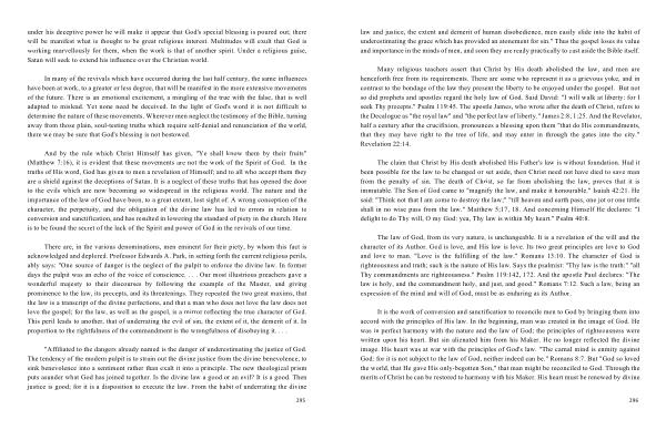 There are , in the various denominations , men eminent for their piety , by whom this fact is acknowledged and deplored . Professor Edwards A . Park , in setting forth the current religious perils , ably says : " One source of danger is the neglect of the pulpit to enforce the divine law . In former days the pulpit was an echo of the voice of conscience . . . . Our most illustrious preachers gave a wonderful majesty to their discourses by following the example of the Master , and giving prominence to the law , its precepts , and its threatenings . They repeated the two great maxims , that the law is a transcript of the divine perfections , and that a man who does not love the law does not love the gospel ; for the law , as well as the gospel , is a mirror reflecting the true character of God . This peril leads to another , that of underrating the evil of sin , the extent of it , the demerit of it . In proportion to the rightfulness of the commandment is the wrongfulness of disobeying it . . . .