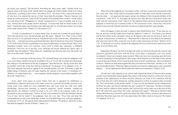 Those who in the judgment are " accounted worthy " will have a part in the resurrection of the just . Jesus said : " They which shall be accounted worthy to obtain that world , and the resurrection from the dead , . . . are equal unto the angels ; and are the children of God , being the children of the resurrection ." Luke 20:35 , 36 . And again He declares that " they that have done good " shall come forth " unto the resurrection of life ." John 5:29 . The righteous dead will not be raised until after the judgment at which they are accounted worthy of " the resurrection of life ." Hence they will not be present in person at the tribunal when their records are examined and their cases decided .