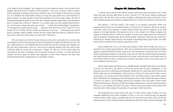 " I will put enmity between thee and the woman , and between thy seed and her seed ; it shall bruise thy head , and thou shalt bruise his heel ." Genesis 3:15 . The divine sentence pronounced against Satan after the fall of man was also a prophecy , embracing all the ages to the close of time and foreshadowing the great conflict to engage all the races of men who should live upon the earth .