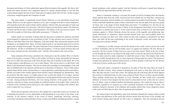 Satan summons all his forces and throws his whole power into the combat . Why is it that he meets with no greater resistance ? Why are the soldiers of Christ so sleepy and indifferent ? Because they have so little real connection with Christ ; because they are so destitute of His Spirit . Sin is not to them repulsive and abhorrent , as it was to their Master . They do not meet it , as did Christ , with decisive and determined resistance . They do not realize the exceeding evil and malignity of sin , and they are blinded both to the character and the power of the prince of darkness . There is little enmity against Satan and his works , because there is so great ignorance concerning his power and malice , and the vast extent of his warfare against Christ and His church . Multitudes are deluded here . They do not know that their enemy is a mighty general who controls the minds of evil angels , and that with well-matured plans and skillful movements he is warring against Christ to prevent the salvation of souls . Among professed Christians , and even among ministers of the gospel , there is heard scarcely a reference to Satan , except perhaps an incidental mention in the pulpit . They overlook the evidences of his continual activity and success ; they neglect the many warnings of his subtlety ; they seem to ignore his very existence .