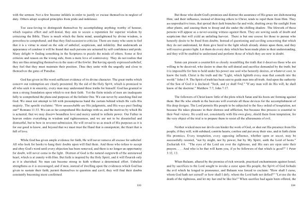 But those who doubt God ' s promises and distrust the assurance of His grace are dishonouring Him ; and their influence , instead of drawing others to Christ , tends to repel them from Him . They are unproductive trees , that spread their dark branches far and wide , shutting away the sunlight from other plants , and causing them to droop and die under the chilling shadow . The lifework of these persons will appear as a never-ceasing witness against them . They are sowing seeds of doubt and scepticism that will yield an unfailing harvest . There is but one course for those to pursue who honestly desire to be freed from doubts . Instead of questioning and caviling concerning that which they do not understand , let them give heed to the light which already shines upon them , and they will receive greater light . Let them do every duty which has been made plain to their understanding , and they will be enabled to understand and perform those of which they are now in doubt .