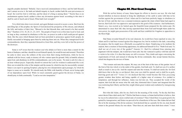 Had Satan revealed himself in his real character , he would have been repulsed at once , for Adam and Eve had been warned against this dangerous foe ; but he worked in the dark , concealing his purpose , that he might more effectually accomplish his object . Employing as his medium the serpent , then a creature of fascinating appearance , he addressed himself to Eve : " Hath God said , Ye shall not eat of every tree of the garden ?" Genesis 3:1 . Had Eve refrained from entering into argument with the tempter , she would have been safe ; but she ventured to parley with him and fell a victim to his wiles . It is thus that many are still overcome . They doubt and argue concerning the requirements of God ; and instead of obeying the divine commands , they accept human theories , which but disguise the devices of Satan .