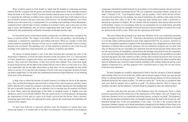 `The soul of King David longed to go forth unto Absalom : for he was comforted concerning Amnon , seeing he was dead .' Verse 39 . " And what is the inference to be deduced from this language ? Is it not that endless suffering formed no part of his religious belief ? So we conceive ; and here we discover a triumphant argument in support of the more pleasing , more enlightened , more benevolent hypothesis of ultimate universal purity and peace . He was comforted , seeing his son was dead . And why so ? Because by the eye of prophecy he could look forward into the glorious future and see that son far removed from all temptations , released from the bondage and purified from the corruptions of sin , and after being made sufficiently holy and enlightened , admitted to the assembly of ascended and rejoicing spirits . His only comfort was that , in being removed from the present state of sin and suffering , his beloved son had gone where the loftiest breathings of the Holy Spirit would be shed upon his darkened soul , where his mind would be unfolded to the wisdom of heaven and the sweet raptures of immortal love , and thus prepared with a sanctified nature to enjoy the rest and society of the heavenly inheritance .
