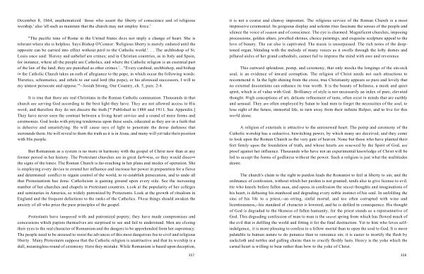 it is not a coarse and clumsy imposture . The religious service of the Roman Church is a most impressive ceremonial . Its gorgeous display and solemn rites fascinate the senses of the people and silence the voice of reason and of conscience . The eye is charmed . Magnificent churches , imposing processions , golden altars , jewelled shrines , choice paintings , and exquisite sculpture appeal to the love of beauty . The ear also is captivated . The music is unsurpassed . The rich notes of the deeptoned organ , blending with the melody of many voices as it swells through the lofty domes and pillared aisles of her grand cathedrals , cannot fail to impress the mind with awe and reverence .