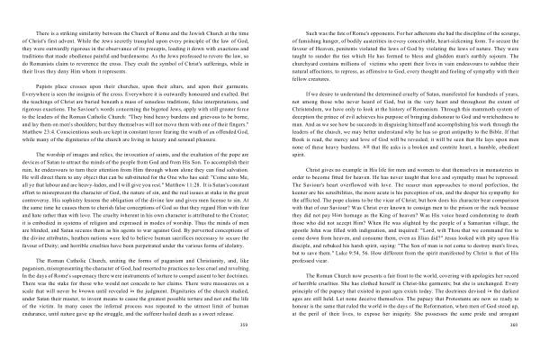 The Roman Catholic Church , uniting the forms of paganism and Christianity , and , like paganism , misrepresenting the character of God , had resorted to practices no less cruel and revolting . In the days of Rome ' s supremacy there were instruments of torture to compel assent to her doctrines . There was the stake for those who would not concede to her claims . There were massacres on a scale that will never be known until revealed in the judgment . Dignitaries of the church studied , under Satan their master , to invent means to cause the greatest possible torture and not end the life of the victim . In many cases the infernal process was repeated to the utmost limit of human endurance , until nature gave up the struggle , and the sufferer hailed death as a sweet release .
