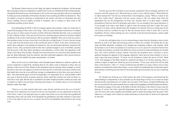 The Roman Church reserves to the clergy the right to interpret the Scriptures . On the ground that ecclesiastics alone are competent to explain God ' s word , it is withheld from the common people . Though the Reformation gave the Scriptures to all , yet the self-same principle which was maintained by Rome prevents multitudes in Protestant churches from searching the Bible for themselves . They are taught to accept its teachings as interpreted by the church ; and there are thousands who dare receive nothing , however plainly revealed in Scripture , that is contrary to their creed or the established teaching of their church .