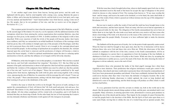 Of Babylon , at the time brought to view in this prophecy , it is declared : " Her sins have reached unto heaven , and God hath remembered her iniquities ." Revelation 18:5 . She has filled up the measure of her guilt , and destruction is about to fall upon her . But God still has a people in Babylon ; and before the visitation of His judgments these faithful ones must be called out , that they partake not of her sins and " receive not of her plagues ." Hence the movement symbolized by the angel coming down from heaven , lightening the earth with his glory and crying mightily with a strong voice , announcing the sins of Babylon . In connection with his message the call is heard : " Come out of her , My people ." These announcements , uniting with the third angel ' s message , constitute the final warning to be given to the inhabitants of the earth .