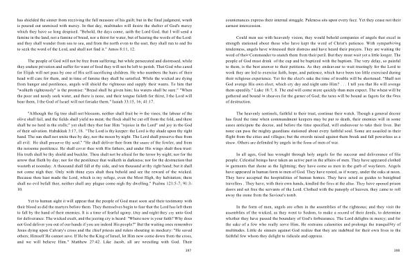 Could men see with heavenly vision , they would behold companies of angels that excel in strength stationed about those who have kept the word of Christ ' s patience . With sympathizing tenderness , angels have witnessed their distress and have heard their prayers . They are waiting the word of their Commander to snatch them from their peril . But they must wait yet a little longer . The people of God must drink of the cup and be baptized with the baptism . The very delay , so painful to them , is the best answer to their petitions . As they endeavour to wait trustingly for the Lord to work they are led to exercise faith , hope , and patience , which have been too little exercised during their religious experience . Yet for the elect ' s sake the time of trouble will be shortened . " Shall not God avenge His own elect , which cry day and night unto Him ? . . . I tell you that He will avenge them speedily ." Luke 18:7 , 8 . The end will come more quickly than men expect . The wheat will be gathered and bound in sheaves for the garner of God ; the tares will be bound as fagots for the fires of destruction .