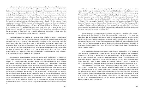 All come forth from their graves the same in stature as when they entered the tomb . Adam , who stands among the risen throng , is of lofty height and majestic form , in stature but little below the Son of God . He presents a marked contrast to the people of later generations ; in this one respect is shown the great degeneracy of the race . But all arise with the freshness and vigour of eternal youth . In the beginning , man was created in the likeness of God , not only in character , but in form and feature . Sin defaced and almost obliterated the divine image ; but Christ came to restore that which had been lost . He will change our vile bodies and fashion them like unto His glorious body . The mortal , corruptible form , devoid of comeliness , once polluted with sin , becomes perfect , beautiful , and immortal . All blemishes and deformities are left in the grave . Restored to the tree of life in the long-lost Eden , the redeemed will " grow up " ( Malachi 4:2 ) to the full stature of the race in its primeval glory . The last lingering traces of the curse of sin will be removed , and Christ ' s faithful ones will appear in " the beauty of the Lord our God ," in mind and soul and body reflecting the perfect image of their Lord . Oh , wonderful redemption ! long talked of , long hoped for , contemplated with eager anticipation , but never fully understood .
