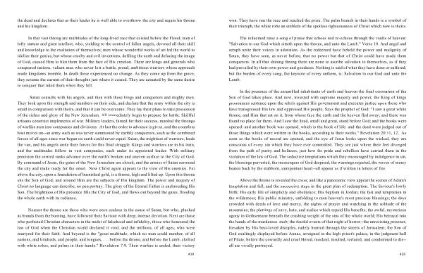 The redeemed raise a song of praise that echoes and re-echoes through the vaults of heaven : " Salvation to our God which sitteth upon the throne , and unto the Lamb ." Verse 10 . And angel and seraph unite their voices in adoration . As the redeemed have beheld the power and malignity of Satan , they have seen , as never before , that no power but that of Christ could have made them conquerors . In all that shining throng there are none to ascribe salvation to themselves , as if they had prevailed by their own power and goodness . Nothing is said of what they have done or suffered ; but the burden of every song , the keynote of every anthem , is : Salvation to our God and unto the Lamb .