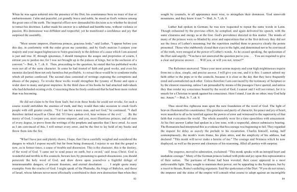Luther had spoken in German ; he was now requested to repeat the same words in Latin . Though exhausted by the previous effort , he complied , and again delivered his speech , with the same clearness and energy as at the first . God ' s providence directed in this matter . The minds of many of the princes were so blinded by error and superstition that at the first delivery they did not see the force of Luther ' s reasoning ; but the repetition enabled them to perceive clearly the points presented . Those who stubbornly closed their eyes to the light , and determined not to be convinced of the truth , were enraged at the power of Luther ' s words . As he ceased speaking , the spokesman of the Diet said angrily : " You have not answered the question put to you . . . . You are required to give a clear and precise answer . . . . Will you , or will you not , retract ?"