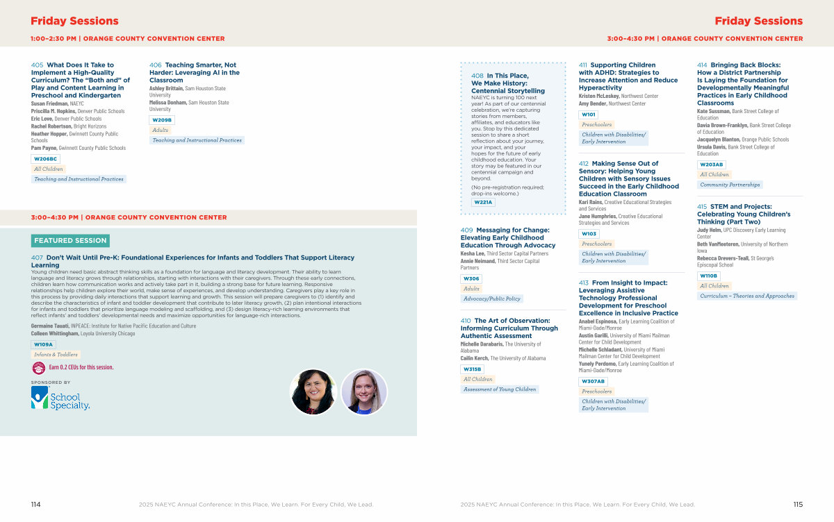 NAEYC is turning 100 next year! As part of our centennial celebration, we’ re capturing stories from members, affiliates, and educators like you. Stop by this dedicated session to share a short reflection about your journey, your impact, and your hopes for the future of early childhood education. Your story may be featured in our centennial campaign and beyond.