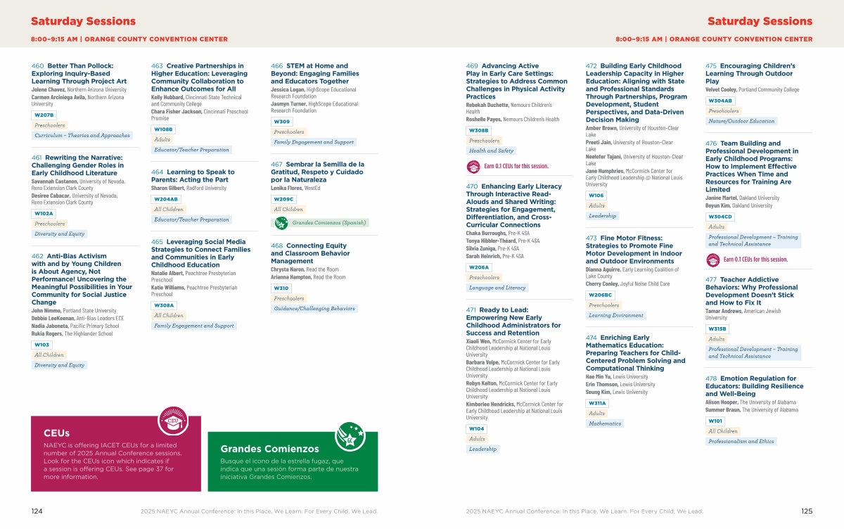 NAEYC is offering IACET CEUs for a limited number of 2025 Annual Conference sessions. Look for the CEUs icon which indicates if a session is offering CEUs. See page 37 for more information.