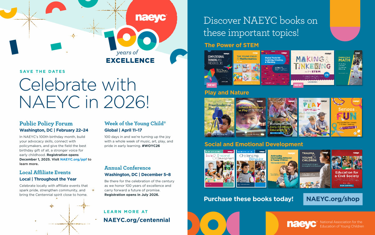 In NAEYC’ s 100th birthday month, build your advocacy skills, connect with policymakers, and give the field the best birthday gift of all, a stronger voice for early childhood. Registration opens December 1, 2025. Visit NAEYC. org / ppf to learn more.
