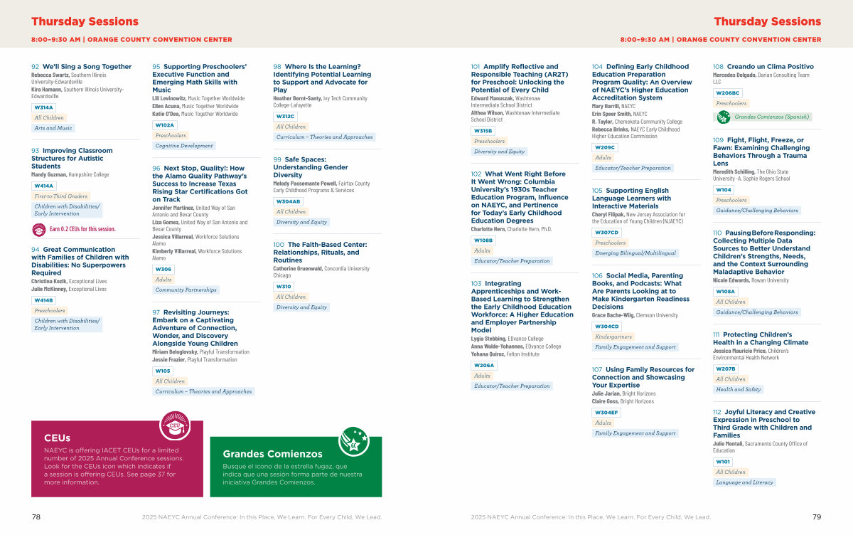 NAEYC is offering IACET CEUs for a limited number of 2025 Annual Conference sessions. Look for the CEUs icon which indicates if a session is offering CEUs. See page 37 for more information.